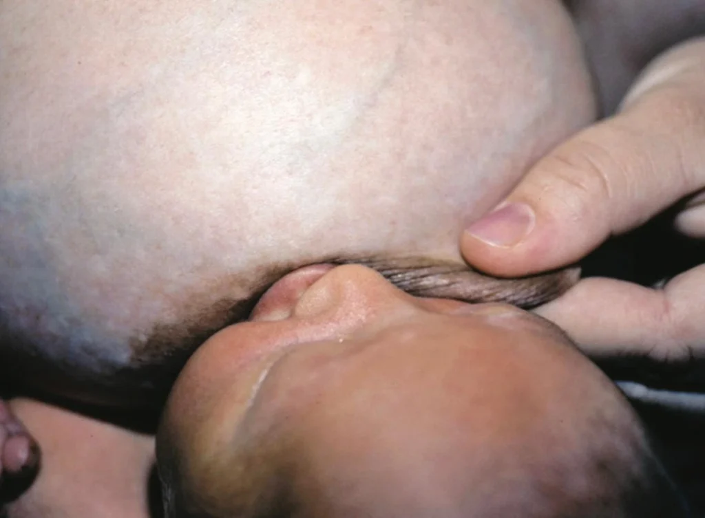 O bebê da imagem apresenta uma fissura labial, e a orientação foi utilizar a elasticidade da mama para cobrir a fissura, favorecendo a formação de um vácuo eficaz durante a sucção.